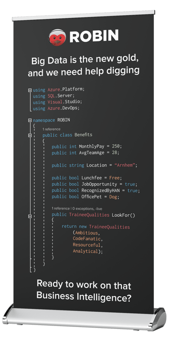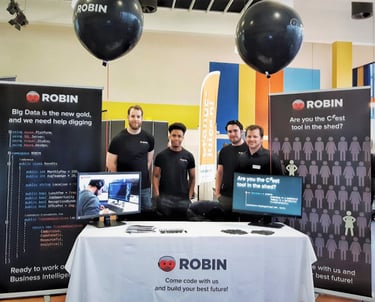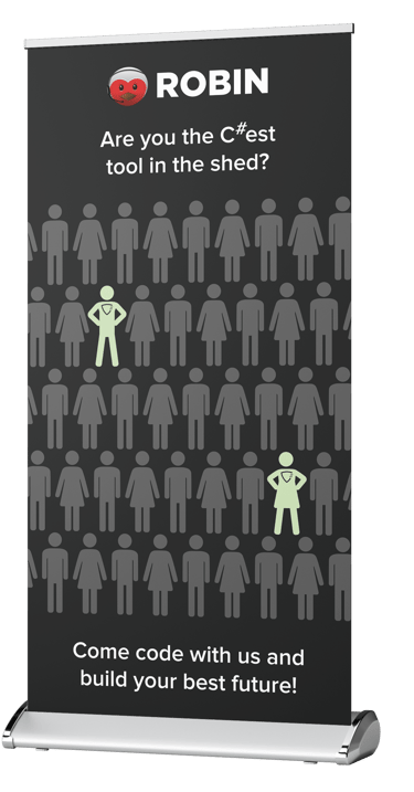 Bekijk hier de bedrijvenmarkt stand die ik heb gerealiseerd om ICT'ers te werven voor het (oud) e-commerce bedrijf ROBIN. Alles is zelf bedacht: van de slogans tot het inzetten van een stuk code om ICT'ers aan te spreken (zie de eerste banner).